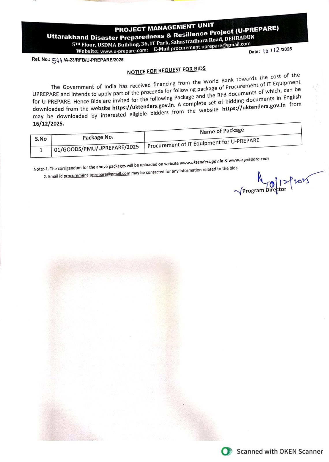 PROCUREMENT OF ICT EQUIPMENTALONG WITH SUPPLY & INSTALLATION FOR ESTABLISHMENT OF STATE EMERGENCY OPERATION CENTRE (SEOC) AT USDMA BUILDING, IT PARK, DEHRADUN / यूएसडीएमए भवन, आईटी पार्क, देहरादून में राज्य आपातकालीन परिचालन केंद्र (SEOC) की स्थापना हेतु आईसीटी उपकरणों की खरीद, आपूर्ति एवं स्थापना |